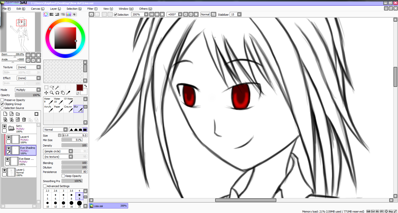 While working on my latest piece, I thought I would make a tutorial for how to color eyes. To color, I use a drawing tablet with stylus and the PaintSai Program. I find using PaintSai is very forgiving as it is easier to use and allows the user to undo several steps rather than one. It should also be noted that a drawing tablet and stylus are not necessary to color on a computer. The same results can be achieved using a mouse, but it may take a bit more time. I find that using a Tablet and Stylus not only makes coloring easier, but fun as well.