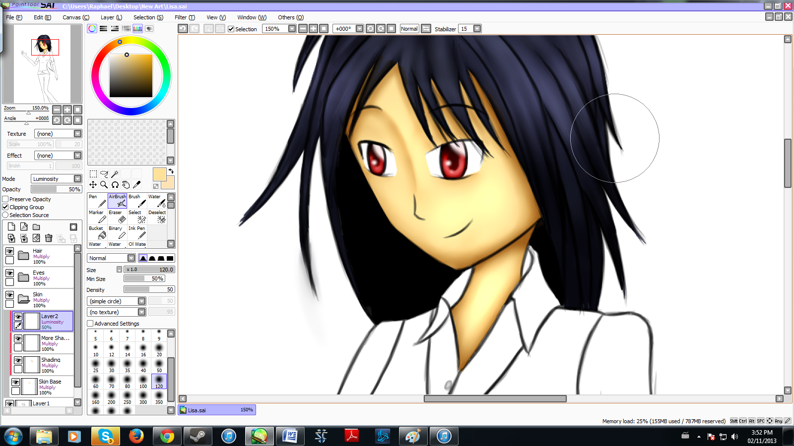 Now the final step is to bring out the original base color. In a new layer above both Shading Layers, set to Luminosity and having the Clipping Group option checked, use the Air Brush to lighten the areas not shaded. Be careful how much Air brushing is done as too much can create a strange, abnormal glow in the character’s skin. A light touch of Air Brush is all that is necessary.